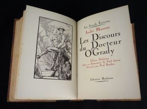 In-8 (16 x 21,8 cm), reliure demi-chagrin, couvertures conservées, dos orné de dorures, tête dorée, gardes couleur, 154 et 159 pages, 2 ouvrages illustrés par Paul Sarrut reliés en un volume : "Les Silences du Colonel Bramble" (1 de 300 exemplaires sur Hollande, sans date) et "Les Discours du Docteur O'Grady" (1929) ; coins légèrement frottés, bel état.