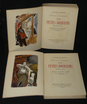Deux volumes in-8 (15c20 cm), broché sous couverture rempliée, 251 et 305 pages, édition du centenaire des œuvres complètes illustrées de Balzac,exemplaire hors commerce, dessins de Gaston Barret gravés sur bois en couleurs par Lucien Larrieu ; 2° volume uniformément pâli, quelques taches et autres menus défauts, bon exemplaire.