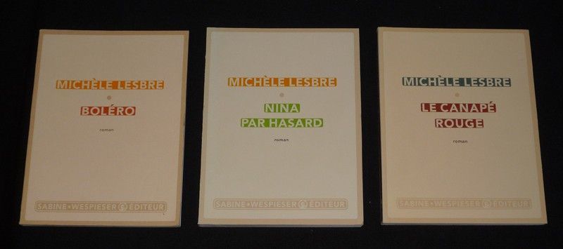 Trois volumes in-12 (14 x 18,3 cm), brochés, lot de 3 ouvrages de Michèle Lesbre : Le Canapé rouge (2007, 148 pp.) - Boléro (2002, 119 pp., avec ENVOI de l'auteur) - Nina par hasard (2010, 189 pp.) ; très bon état général.