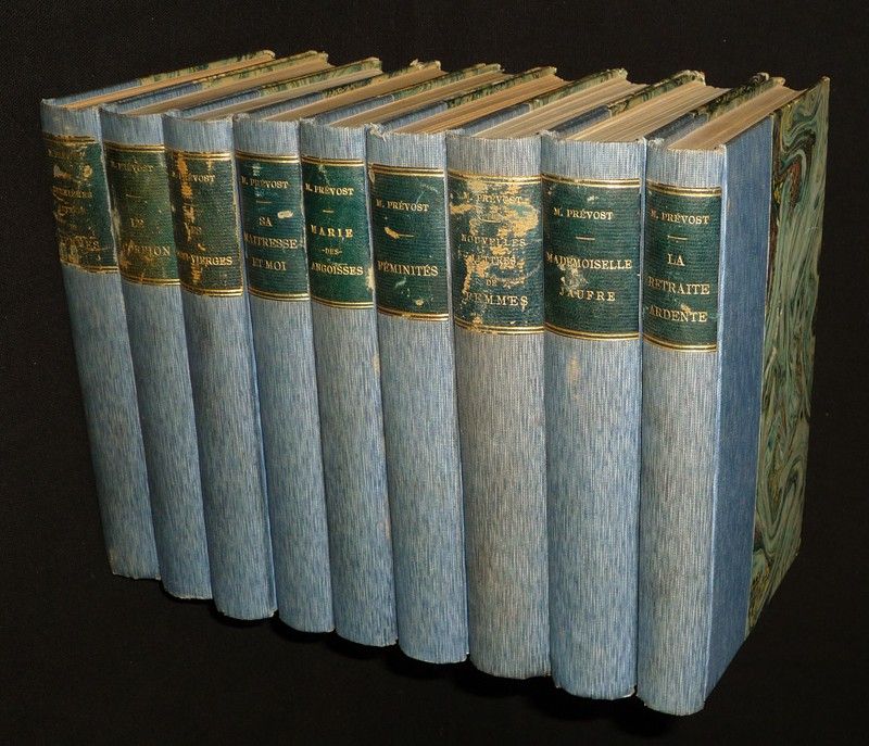 Neuf volumes in-12 (12,7 x 18,8 cm), reliure uniforme en demi-toile et pièce de titre au dos pour ces 9 ouvrages de Marcel Prévost dont 6 édités par Lemerre, 2 aux Editions de France et 1 chez Flammarion. Cet ensemble comprend les oeuvres suivantes : Dernières lettres de femmes // Féminités // Nouvelles lettres de femmes // Mademoiselle Jaufre // La Retraite ardente // Sa maîtresse et moi // Marie des angoisses // Le Scorpion // Les Demi-vierges ; dos un peu insolés, frottements aux coiffes, coupes et pièces de titre, usure au premier plat du volume "Marie des angoisses", intérieur bruni, par ailleurs assez bon état.