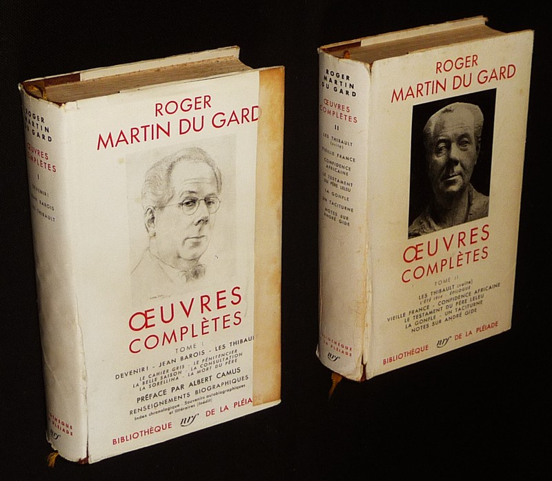Deux volumes in-12 (11 x 18 cm), reliure d'éditeur sous jaquette, CLXVII-1403 et 1433 pages, ces volumes imprimés en 1955 contiennent : Devenir! - Jean Barois - In Mémoriam. Les Thibault : Le Cahier gris - Le Pénitencier - La Belle saison - La Consultation - La Sorellina - La Mort du père - L'Été 1914 - Épilogue. Vieille France - Confidence africaine. Théâtre : Le Testament du Père Leleu - La Gonfle - Un taciturne. Notes sur André Gide (1913-1951) ; jaquettes usées présentant des frottements, plissures et petites déchirures notamment aux mors et pliures des rabats, réparation au sotch papier à la pliure du premier plat de la jaquette du tome 1, par ailleurs assez bon état général hors jaquettes.
