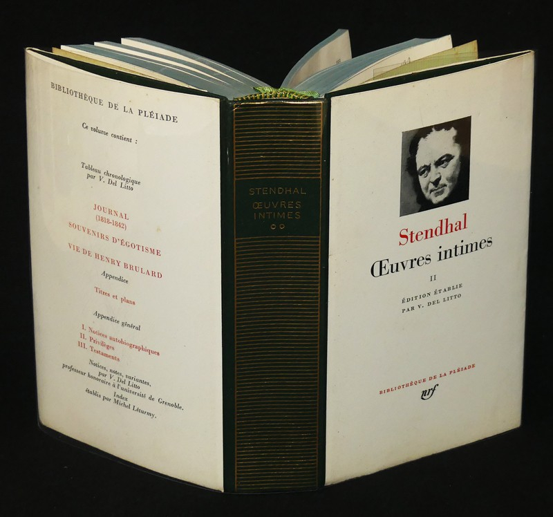 In-12 (11,2 x 17,5 cm), reliure d'éditeur pleine peau sous demi-jaquettes et rhodoïd, sans l'emboîtage muet, XIV-1717 pages, ce volume contient : Journal [1818-1842] - Souvenirs d'égotisme - Vie de Henry Brulard. Appendice général : Notices autobiographiques - Privilèges - Testaments, édition de Del Litto ; gardes piquées, dos légèrement incurvé, état très satisfaisant.