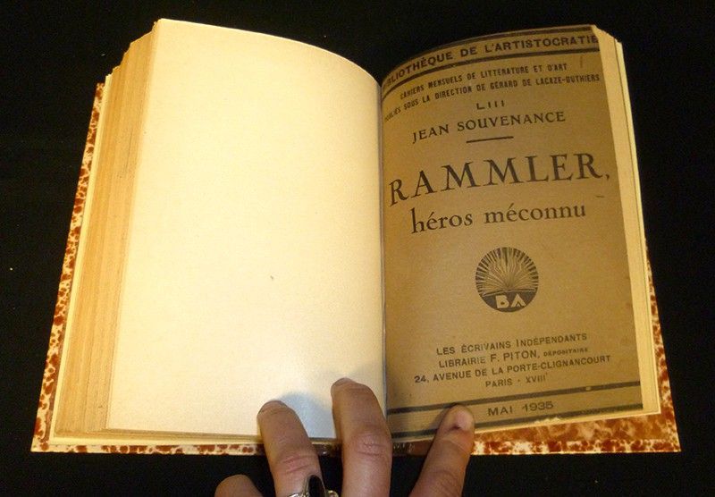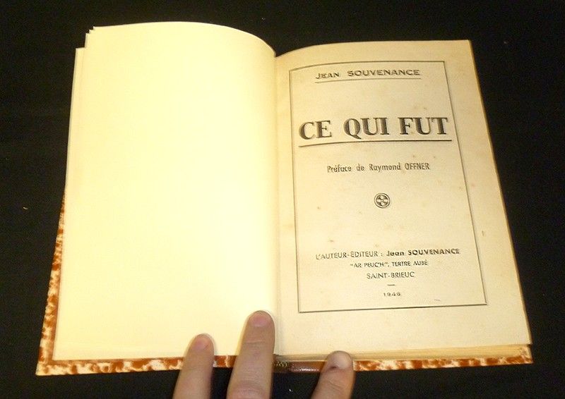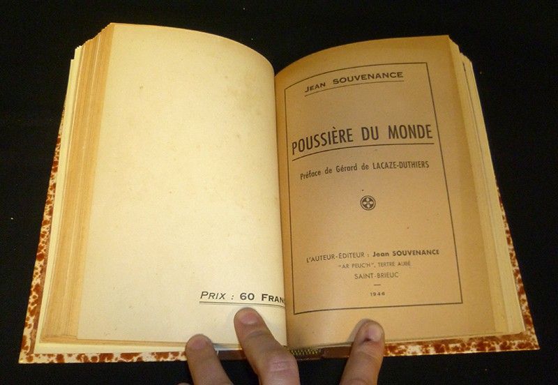 In-814.2 x 20 cm), relié demi-basane, dos à 5 nerfs avec titre doré, couvertures d'origine conservées. Cet ouvrage constitue un recueil d'un roman et autres écrits de Jean Souvenance, pseudonyme de Serge Grégoire, natif d'Ille-et-Vilaine (fondateur du Parti Pacifiste Internationaliste) : 1. Ce qui fut (1982, 143 pages) // 2. Poussières du monde (1946, 131 pages) // 3. Retour d'Italie fasciste : Impressions et Réflexions (n°3 février 1938, 16 pages) // 4. Lettre sur L'Islam (1944, 8 pages) // 5. Rammler, héros méconnu (1935,62 pages), photographies et illustrations en noir et blanc hors-texte ; des rousseurs et marques d'usage sur les plats d'origine, par ailleurs intérieur bien conservé, bon état général.