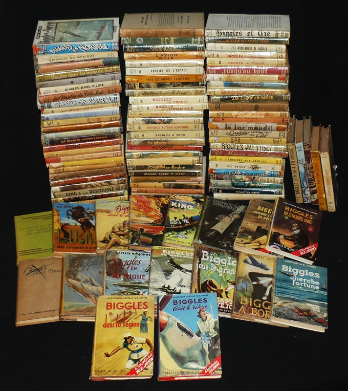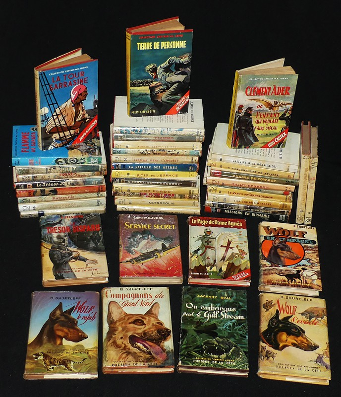 Lot de cent trente-neuf volumes in-12, cartonnés dont la plupart sous jaquette illustrée, 136 titres de la collection "Captain Johns" (+ 3 doubles), ce lot comprend les titres suivants : CAPTAIN W.E. JOHNS aux PRESSES DE LA CITE : Aventures dans la mer de corail // (Worrals) Au-dessus de la foret vierge // no.1 - (Biggles et les) Corsaires du Pacifique // no.2 - Jeunes filles de l'Intelligence Service // no.3 - (Biggles dans) Le bal des Spitfires // no.4 - Rendez-vous en Extrême-Orient // no.5 - King et ses hommes // no.6 - Commandos en France // no.7 - Le cygne jaune // no.8 - Le trésor des flibustiers // Les Pirates du Pôle Sud // no.10 - Le mystère des avions disparus // no.11 - Jusqu'au bout // no.12 - Mission en Catalogne // no.13 - Biggles dans les Mers de Sud // no.14 - Biggles à Bornéo // no.15 - King dans la jungle // no.16 - Le lac maudit // no.17 - Biggles joue le grand jeu // no.18 - La vallée des serpents à sonnettes // no.19 - Biggles et Cie // no.20 - Biggles au Tibet // no.21 - Biggles au grand nord // no.22 - Aventuriers de l'air // no.23 - Biggles en Afrique // no.24 - Biggles s'en va-t-en guerre // no.25 - Biggles combattant du ciel // no.26 - Biggles en permission // no.27 - King à la rescousse // no.28 - La bataille dans le désert // no.30 - Le démon des sables // no.31 - Biggles cherche de l'or en barre // no.32 - Service secret // no.33 - Biggles en danger // no.35 - Biggles en Arabie // no.36 - King et ses brigands // no.37 - l'île interdite // no.43 - Biggles détective de l'air // no.45 - La momie égyptienne // no.46 - King et les loups-garous // no.47 - Retour de King // no.48 - Rendez-vous avec Biggles // no.49 - Worrals courrier secret // no.50 - Biggles dans le désert // no.51 - Aux mains des pirates // no.52 - Biggles porté manquant // no.53 - Les exploits de Biggles // no.54 - Worrals et l'opale noire // no.55 - King chez les Indiens // no.56 - C'est X... qui frappe // no.57 - Biggles reprend le manche // no.58 - Espions de l'air // no.59 - Biggles en croisière // no.60 - Biggles entre en scène // no.62 - Château fort et faux billets // no.63 - La piste du chien blanc // no.64 - L'avion noir // no.65 - Biggles à la dérive // no.66 - Biggles chez l'ennemi // no.67 - Biggles en France // no.72 - Biggles court le risque // no.74 - Biggles, pilote de chasse // no.75 - Biggles en Corée // no.77 - Tout va bien // no.79 - Biggles et l'eléphant noir // no.83 - King répond à tout // no.89 - Biggles à la Jamaique // no.93 - Biggles en Mongolie // no.100 - Huit affaires pour Biggles // no.105 - Rois de l'espace // no.107 - King et les Zombies // no.108 - Biggles autour du monde // no.109 - Biggles dans la Légion // no.110 - Biggles et le puzzle Chinois // no.111 - Biggles en Australie // no.112 - Biggles l'échappe belle // no.113 - Retour sur Mars // no.116 - L'aventure sans frontière (en double) // no.117 - Biggles, jeune pilote // no.119 - Biggles fait ses premières armes // no.121 - (La) Croisière aux étoiles // no.122 - Biggles en Sologne // no.127 - Biggles à Soho // no.128 - Captifs de l'espace // no.132 - Vers les mondes lointains // no.137 - L'île mystérieuse de Biggles // no.139 - Biggles enterre la hache de guerre // no.142 - Biggles au Mexique // no.148 - Où plane l'aigle // no.150 - Biggles aux Indes // no.153 - Biggles cherche fortune // no. 159 - Biggles s'en mêle // COLLECTION ILLUSTREE : no.1 - Biggles au Cap Horn // COLLECTION LES AMIS DES JEUNES (ARTHAUD) : no.4 - Worrals en missions // Biggles en Norvège // Biggles en Egypte // HACHETTE : Un exploit de Worrals (sans jaquette) // AUTRES AUTEURS, PRESSES DE LA CITE : Wolf le rajah (Bertrand Shurtleef) // Compagnons du Grand Nord (Bertrand Shurtleef) // On embarque pour le Gulf Stream (Zachary Ball) // Wolf s'évade (Bertrand Shurtleef) // Le Trésor disparu (E. Ellsberg) // Le Page de Dame Agnès (Yvonne Morance) // Wolf en campagne (Bertrand Shurtleef) // La Tour Sarrasine (Ralph Hammond) // Flamme au Sahara (Eric Leyland) // La Forêt secrète (Zachary Ball) // Frères de la côte (Ernst Löhndorff) // Le Trésor de Lima (Ralph Hammond, deux éditions différentes) // Patrouille en Nouvelle Guinée (Bertrand Shurtleff) // Rescapés de la banquise (Bertrand Shurtleff) // Le Drame du Virgo Fidelis (Joseph Perrin) // Terre de personne (André Demaison) // Flamme en Afrique (Eric Leyland) // Flamme commence (Eric Leyland) // Flamme relève le défi (Eric Leyland) // Flamme mène l'enquête (Eric Leyland) // La Bataille des astres (Paul French) // Rois de l'espace (Brane et Clinton) // Opération "Soucoupe" (Ivan Southall) // L'or perdu (Wilfrid Robertson) // Le Mystère du Delta (Zachary Ball) // Astropolis (Alfred Fritz) // Venus contre la Terre (Paul French) // Clément Ader ou l'enfant qui voulait se faire oiseau (Louis Castex) // Histoire d'un hors-la-loi (Henry G. Lamond) // Garçons sur un voilier (Peter Dawlish) // Graine de cowboy (Ralph Moody) // Saint-Exupéry, pilote légendaire (Jean Bruce) // Le Ranch du Grand Losange (Ralph Hammond) // Allô contrôle ici radar (Ivan Southall) // Le lac aux sept secrets (Sam Campbell) // Missions en Birmanie (Kenneth Ross) // Flamme le libérateur (Eric Leyland) // Pavillon noir (Ernst Londorff) // Flamme chez les coupeurs de têtes (Eric Leyland) ; coupes et coiffes frottés, état variable selon le volume notamment aux jaquettes, dont certaines peuvent présenter des manques et frottements assez importants, assez bon état général.