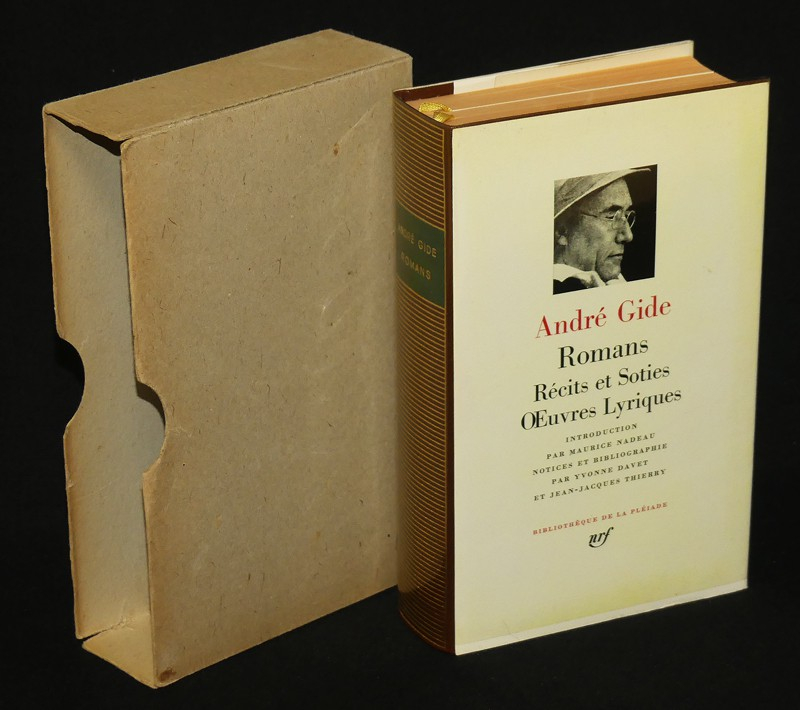 In-12 (11 x 18 cm), reliure d'éditeur pleine peau sous demi-jaquette, rhodoïd et emboîtage muet, XL-1614 pages, ce volume contient : Le Traité du Narcisse - Le Voyage d'Urien - La Tentative amoureuse - Paludes - Les Nourritures terrestres - Les Nouvelles Nourritures - Le Prométhée mal enchaîné - El Hadj ou Le Traité du faux prophète - L'Immoraliste - Le Retour de l'Enfant Prodigue - La Porte Étroite - Isabelle - Les Caves du Vatican - La Symphonie pastorale - Les Faux-Monnayeurs - L'École des femmes - Robert - Geneviève ou La confidence inachevée - Thésée, introduction par Maurice Nadeau, notices et bibliographie par Yvonne Davet et Jean-Jacques Thierry ; rhodoïd jauni, très bon état général.