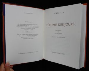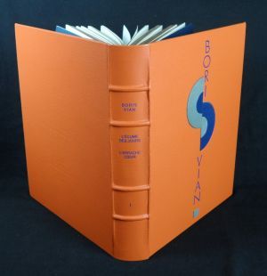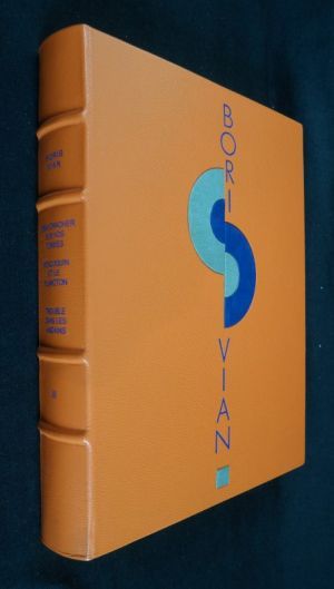 TIRAGE DE TöTE. Cinq volumes in-4 (21,5 x 29 cm), reliure d'éditeur plein cuir fauve grain maroquin sous emboîtage bordé, têtes dorées, quatre nerfs au dos, mosaïque de cuirs bleu marine et gris sur les premiers plats, protégés par une custode transparente, comprenant une suite des 72 compositions réunies en un coffret cuir sous étui, tirage de tête, 1 de 300 exemplaires (ici le n°202), préface de François Caradec, édition illustrée par Roland Topor, Milton Glaser, Jean Lagarrigue, Desclozeaux et Jean-Michel Folon ; Tome I : L'Ecume des jours. L'Arrache-coeur (477 pp) ; Tome II : L'Automne à Pékin. Elles se rendent pas compte (427 pp) ; Tome III : J'irai cracher sur vos tombes. Vercoquin et le plancton. Trouble dans les Andains (453 pp) ; Tome IV : L'Herbe rouge. Les Morts ont tous la même peau. Et on tuera tous les affreux (467 pp) ; pas de custode au tome III et pour la suite soit un léger frottement à la mosaïque de ces 2 premiers plats, un nerf (tome I) présente un léger frottement, rares traces aux emboîtages, par ailleurs excellent état d'ensemble.