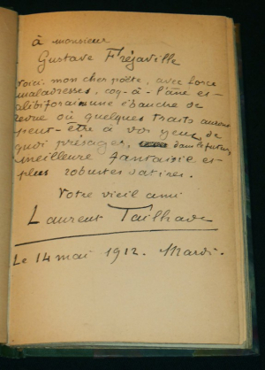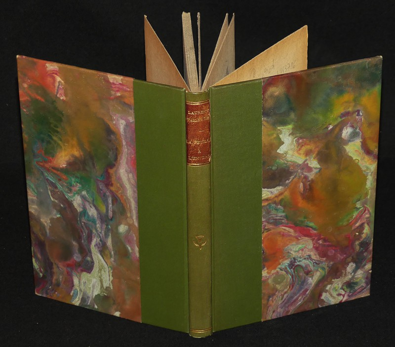 In-12 relié, demi toile à la bradel, pièce de titre grenat, couverture conservée, 66 pages, EDITION ORIGINALE sur papier d'édition (après seulement 15 sur beaux papiers), Service de Presse, TRES BEL ENVOI de l'auteur à Gustave Fréjaville ; bord de la pièce de titre légèrement frottée, papier légèrement jauni, bel état.
