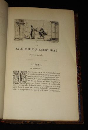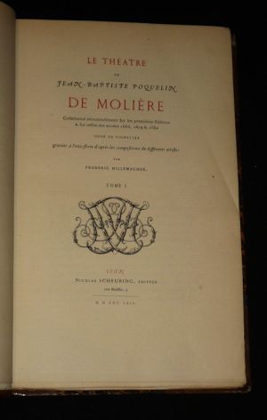 Huit volumes in-8 (15 x 22,5 cm), reliure demi-chagrin à coins, dos à 5 nerfs orné de caissons et fers dorés, pièce de titre et de tomaison, filets dorés aux plats, XV-409, 450, 455, 424, 439, 411, 447 et 466 pages, édition de 1864-1880, illustrée de vignettes gravées par Frédéric Hillemacher. Les oeuvres présentées après un court chapitre biographique sur Molière sont les suivantes : La Jalousie du Barbouillé - Le Médecin volant - L'Estourdy - Dépit amoureux - Les Précieuses ridicules - Sganarelle ou le Cocu imaginaire - Dom Garcie de Navarre ou le Prince jaloux - L'Ecole des maris - Les Fascheux - L'Escole des femmes - La Critique de l'Escole des femmes - L'Impromptu de Versailles - Le Mariage forcé - Les Plaisirs de l'Isle enchantée - Dom Juan ou le Festin de Pierre - L'Amour médecin - Le Misantrope - Le Médecin malgré lui - Mélicerte - Pastorale comique - Le Sicilien ou l'amour peintre - Le Tartuffe ou l'imposteur - Amphitryon - Feste de Versailles - George Dandin ou le Mari confondu - L'Avare - Monsieur de Pourceaugnac - Le Divertissement royal - Le Bourgeois gentilhomme - Psiché - Les Fourberies de Scapin - La Comtesse d'Escarbagnas - Les Femmes savantes - Le Malade imaginaire - Meslanges de vers et de prose ; frottements sur le cuir aux coiffes, nerfs, mors et coins, par ailleurs bon état général.
