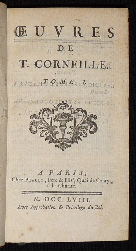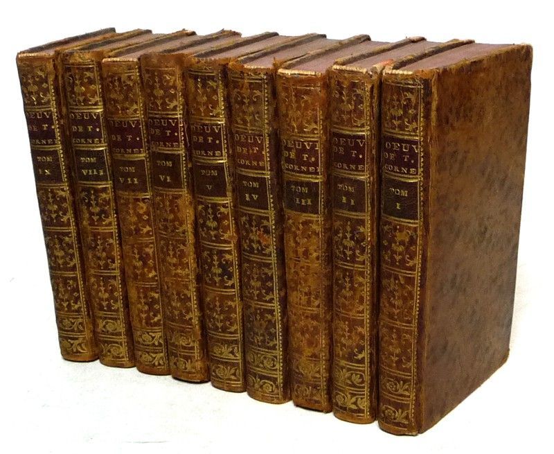 Neuf volumes in-12 (8,7 x 14,6 cm), reliure d'époque plein veau, dos lisses ornés de dorures, pièce de titre et de tomaison, tranches rouges, gardes couleur, 316, 311, 366, 369, 345, 338, 374, 332 et 282 pages, ces volumes contiennent les oeuvres suivantes : Les Engagemens du Hazard / Le Feint Astrologue / D. Bertrand de Cigarral / L'Amour à la mode / Le Berger extravagant / Le Charme de la voix / Le Geôlier de soi-même / Les Illustres ennemis / Timocrate / Bérénice / La Mort de l'empereur / Darius / Stilicon / Le Galant Doublé / Camma / Maximian / Pyrrhus / Persée et Démétrius / Antiochus / Laodice / Le Baron d'Albirac / La Mort d'Annibal / La Comtesse d'orgueil / Théodat / Le Festin de Pierre / La Mort d'Achille / D. César d'Avalos / Circé / L'Inconnu / Le Comte d'Essex / Bradamante ; quelques épidermures aux mors et bords des plats, mors supérieur du tome 7 fendu en queue, tranchefil exposé à la coiffe supérieure de 6 des volumes, par ailleurs intérieur frais, bon état général pour ce bel ensemble.