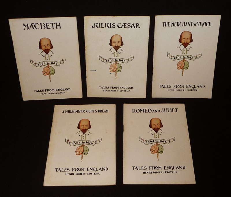 In-12 (13,5 x 18,3 cm), dos agrafé, texte en anglais, 5 fascicules de la collection "Tales from England", version abrégée et simplifiée de 5 pièces de Shakespeare : The Story of Macbeth - The Story of Julius Caesar - The Story of The Merchant of Venice - The Story of A Midsummer Night's Dream - The Story of Romeo and Juliet ; dos frottés, quelques traces, rousseurs et marques d'usage sur les plats, par ailleurs assez bon état général.