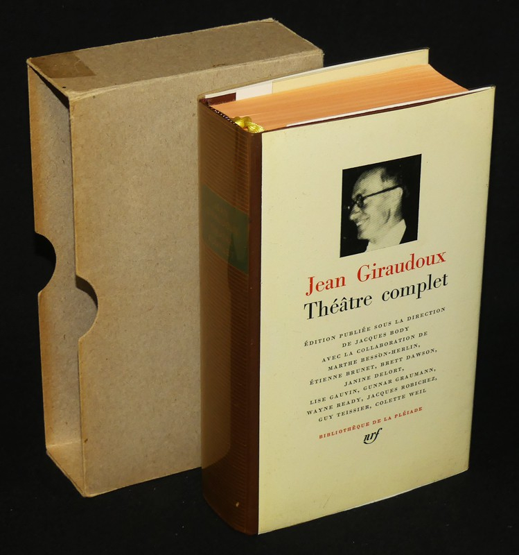 In-12 (11 x 17,5 cm), reliure d'éditeur pleine peau sous demi-jaquettes, rhodoïd et emboîtage muet, XXXVII-1854 pages, ce volume contient : Siegfried. Fugues sur Siegfried. Fin de Siegfried - Amphitryon 38 - Judith - Intermezzo - Tessa - La Guerre de Troie n'aura pas lieu - Supplément au voyage de Cook - Électre - L'Impromptu de Paris - Cantique des Cantiques - Ondine - Sodome et Gomorrhe - L'Apollon de Bellac - La Folle de Chaillot - Pour Lucrèce - Les Gracques. Appendice : Les Siamoises, édition de Jacques Body ; rhodoïd jauni, bon état.