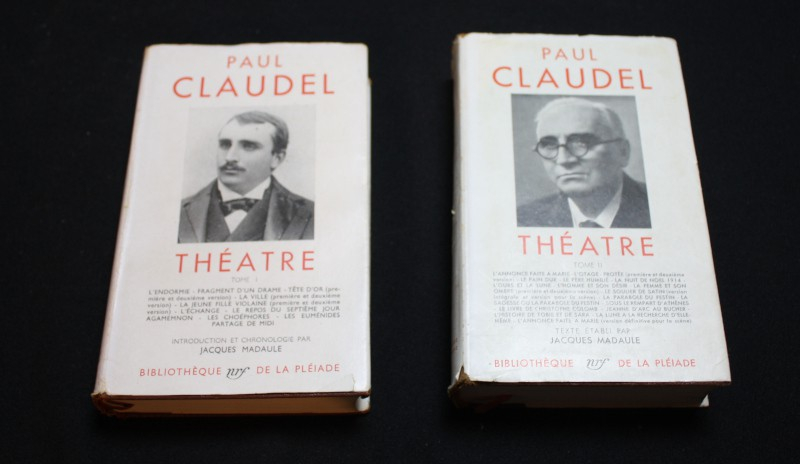 Deux volumes in-12 (11 x 17,5 cm), reliure d'éditeur avec jaquettes sans les emboîtages muets, XLIII-1010 et 1336 pages, imprimés en 1947 et 1948, ces volumes contiennent : L'Endormie - Fragment d'un drame - Tête-d'or - La Ville - La Jeune Fille Violaine - L'Echange - Le Repos du septième jour - Agamemnon - Les Choéphores - Les Euménides - Partage de midi - L'Annonce faite à Marie - L'Otage - Protée - Le Pain dur - Le Père humilié - La Nuit de Noël 1914 - L'Ours et la Lune - L'Homme et son désir - La Femme et son ombre - Le Soulier de Satin - Le Parabole du festin - Sous le rempart d'Athènes - Le Livre de Christophe Colomb - Jeanne d'Arc au bûcher - L'Histoire de Tobie et de Sara - La Lune à la recherche d'elle-même - L'Annonce faite à Marie (version définitive pour la scène), introduction et chronologie par Jacques Madaule ; dos des jaquettes insolés,menus incidents sur plats des jaquettes, frottements aux coiffes, état moyen.
