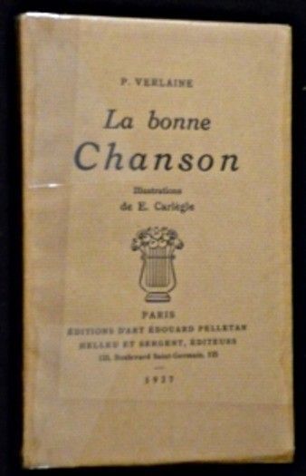 In-12 (10,5 x 16 cm), broché, couverture rempliée, 95 pages, belle édition de ce fameux recueil de Paul Verlaine illustrée par E. Carlègle ; menu manque papier au bas du dos, petite insolation au premier plat, une inscription sur la page de garde, intérieur très frais, bel état.