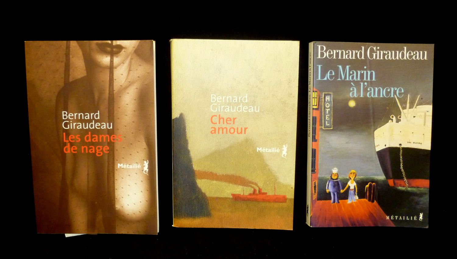 Trois volumes in-8 (12 x 20.5 cm) et (14 x 21.5 cm), brochés, lot de 3 romans de Bernard Giraudeau édités chez Métailié : Les dames de nage (2007, 249 pp ; légères taches d'usage aux plats) - Cher amour (2009, 267 pp. ; bords légèrement frottés) - Le Marin à l'ancre (2001, 214 pp. ; grosse pliure au 1er plat, bords légèrement frottés, quelques taches d'usage aux plats) ; assez bel état.