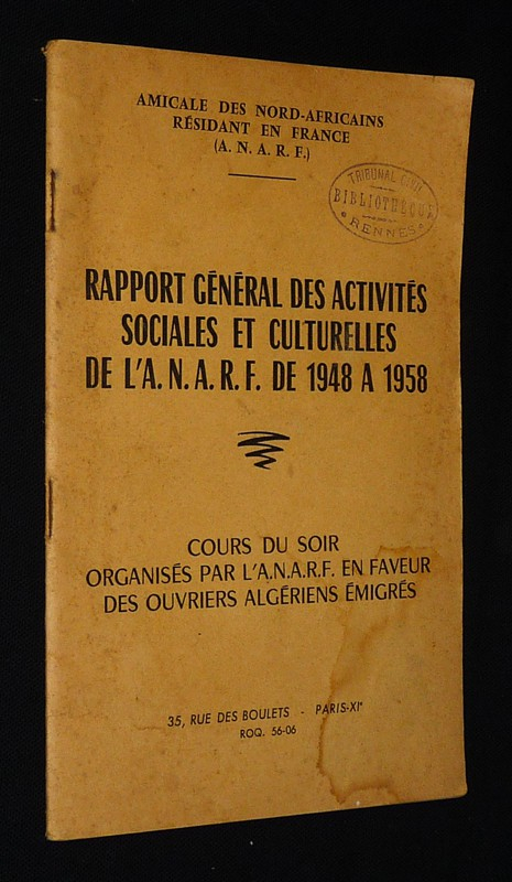 Rapport général des activités sociales et culturelles de l'A.N.A.R.F. de 1948 à 1958