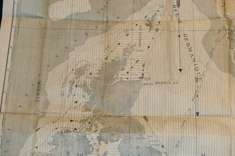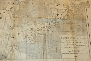 Rare plaquette de 85 pages au format in-8 (16 * 25 cm), bien complet de la très grande carte : marche de l'onde-marée le jour de la pleine lune dans l'océan germanique & dans l'océan atlantique...