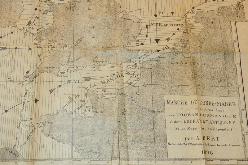 Rare plaquette de 85 pages au format in-8 (16 * 25 cm), bien complet de la très grande carte : marche de l'onde-marée le jour de la pleine lune dans l'océan germanique & dans l'océan atlantique et des mers qui en dépendent. Envoi de l'auteur "à Monsieur Adrien Oursel, vicaire de St jean la Neuville à sa ferme. Souvenir affectueux de l'auteur. L'auteur A. Bert est également auteur de la "Loi d'Orientation de l'entrée des Ports à Marées" et de plusieurs autres lois naturelles. Auteur du nouveau système d'amélioration d'estuaires des fleuves à marées au moyen de goulets concordants. Il était hydrographe consultant sur les projets de création de ports à marées ou d'amélioration de l'embouchure des fleuves ; manques à la couverture (voir photo) quatrième plat détaché, carte en bon état, sans déchirure.