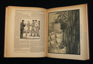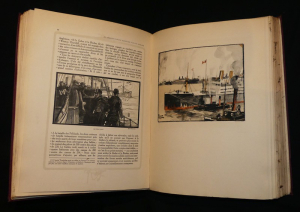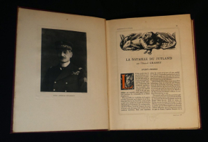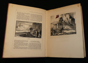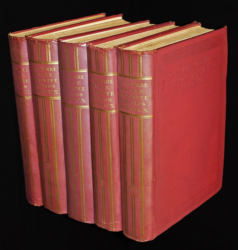 5 forts volumes in-4 (18x27 cm), pleine toile bordeaux de l'éditeur, les couvertures conservées sont illustrées par FOUQUERAY , 173 planches en noir et en couleurs, la plupart de Charles FOUQUERAY et innombrables illustrations dans le texte, le tout organisé par une mise en page des plus agréable et imprimé sur beau papier, sans doute le plus beau livre sur la guerre navale durant la guerre 14-18. Imprimé vers 1920, sur deux types de papier, chaque tome est divisé en deux parties : I-le récit des amiraux, II-les notes et documents authentiques ; menus défauts sur les coins et les coiffes, bel exemplaire.