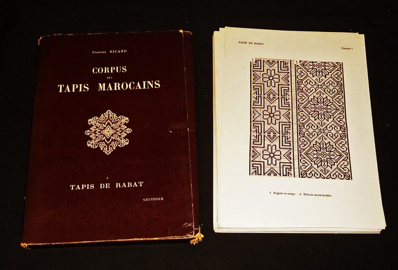 In-4 (19 x 27 cm), chemise contenant un livret de texte de 31 pages et les 64 planches ; chemise abîmée (usures sur les bords, coin corné, mors fendus aux coiffes, frottements aux plats), ex-libris manuscrit, par ailleurs intérieur frais, assez bon état général.