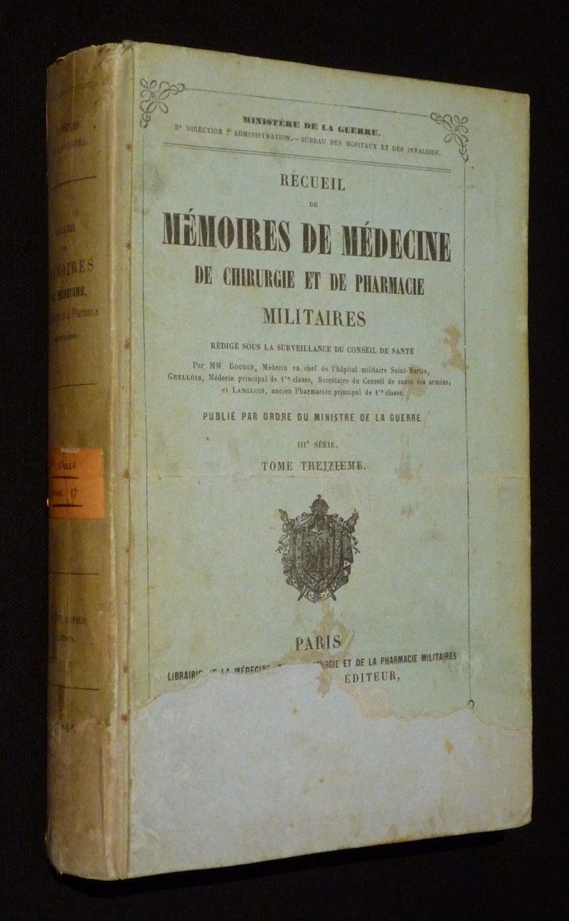 In-8 (14,2 x 21,9 cm), cartonné, 556 pages, Recueil de mémoires de médecine, de chirurgie et de pharmacie militaires. IIIe série, tome dix-septième (le premier plat mentionnant "tome treizième" est erroné) ; dos bruni, quelques traces et marques d'usage sur les plats, manque de papier reliure sur le premier plat, par ailleurs intérieur bien conservé, assez bon état général.