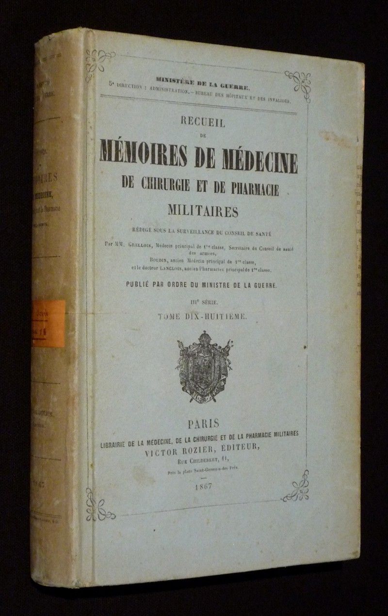 In-8 (14,2 x 21,9 cm), cartonné, 556 pages, Recueil de mémoires de médecine, de chirurgie et de pharmacie militaires. IIIe série, tome dix-huitième ; dos bruni, quelques traces et marques d'usage sur les plats, par ailleurs intérieur bien conservé, assez bon état.