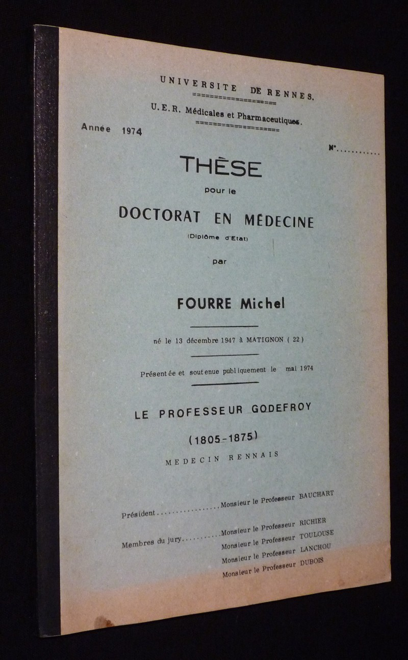 In-4 (20,8 x 29 cm), dos carré collé, 75 pages, thèse pour le doctorat en médecine par Michel Fourre (1974) ; bords des plats brunis, intérieur frais, bon état générl.
