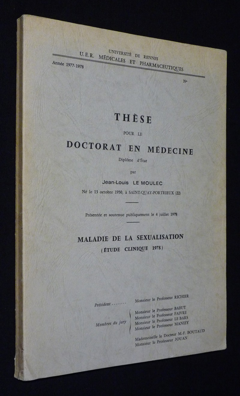 In-4 (21 x 29,5 cm), dos carré collé, 113 pages, thèse pour le doctorat en médecine par Jean-Louis Le Moulec(1978) ; quelques petites traces d'usage sur le dos et le quatrième plat, bon état général.
