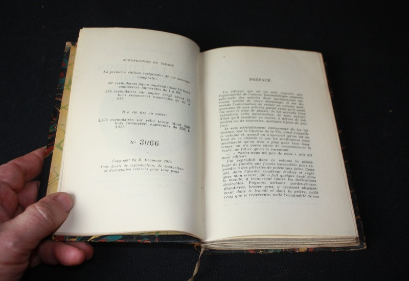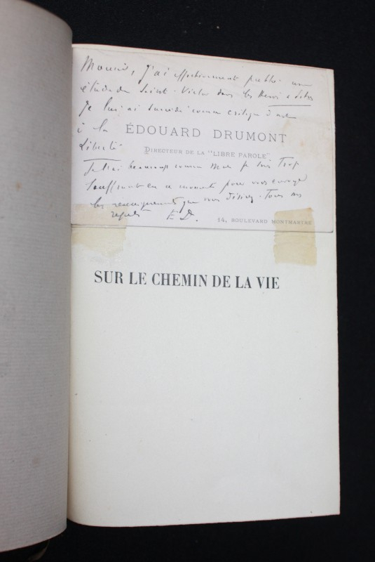 In-12 relié demi-chagrin brun, couverture conservée, un des 3300 sur Vélin teinté, portrait frontispice, envoi d'Edouard Drumont sur sa carte de visite : "Maurice j'ai effectivement publié une étude de Saint-Victor dans les... Je lui ai succédé comme critique d'art à la liberté ; mors et nerfs bien frottés, intérieur frais.