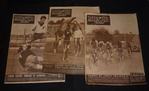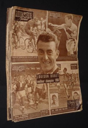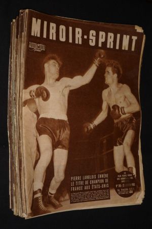 In-4 (26,5 x 35,5 cm), dos agrafé, lot de 14 numéros de la revue Miroir Sprint : n°136 (10 janvier 1949), 138, 141, 153, 156, 161, 162, 163, 165, 167, et 171 (15 juillet 1949) ; dos et bordures usées, assez bon état général.