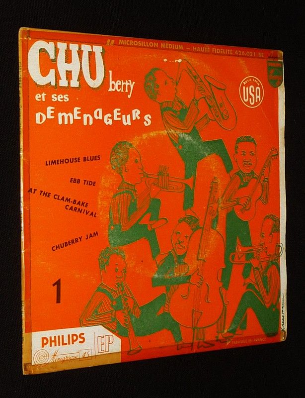 Disque vinyle 45T "Chu Berry et ses Déménageurs" contenant les titres suivants : Limehouse Blues / EBB Tide / At the Clambake Carnival / Chuberry Jam ; ruban adhésif sur les bords de la pochette, frottements au recto de la pochette, traces et étiquette ex-libris au verso, le disque ne semble pas présenter d'incident majeur, assez bon état général.