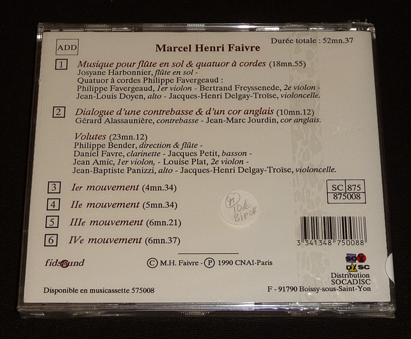 1 CD ""Musique pour flûte en sol et quatuor à cordes - Dialogue d'une contrebasse et d'un cor anglais - Volutes"" de Marcel Henri Faivre neuf, sous blister.