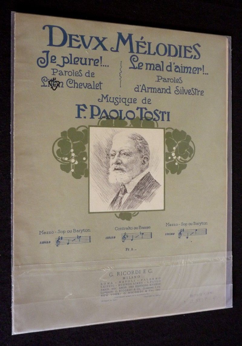 In-4 (26 x 34,4 cm), partition pour Deux mélodies : "Je Pleure !", paroles de Liton Chevalet, et "Le Mal d'aimer", paroles d'Armand Silvestre, musique de F. Paolo Tosti ; dos légèrement frotté, papier bruni, bon état général.