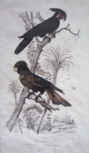 In-8 (18,8 x 26,2 cm), gravure en couleurs pour illustrer l'Histoire naturelle de Buffon ; Planche 477 : Perroquets : mycroglosse noir, perroquet de Banks ; papier légèrement froissé, quelques légères traces, bon état général.