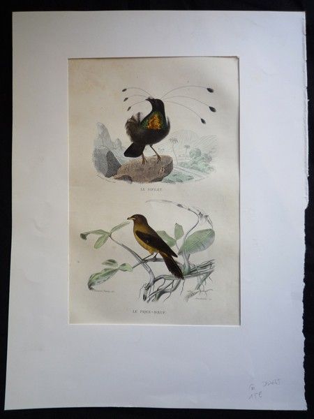 In-4 (17 x 26,5 cm), gravure de Traviès en couleurs pour illustrer l'Histoire naturelle de Buffon, sans date (XIXe siècle), représentant des oiseaux : ici le sifilet et le pique-boeuf ; gravure aquarellée et gommée sur papier fort ; infimes rousseurs, très bel état.