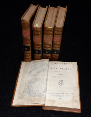 5 volumes in-12, (8.5x13.5 cm), relié plein veau, pièces de titre et de tomaison sur chaque dos, environ 270-300 pages chaque volume, sans date (mention an VII), édition stéréotypé ; tampon...