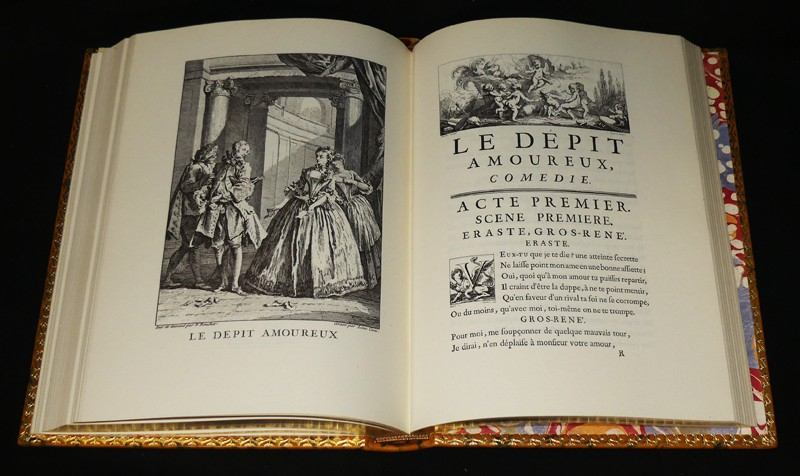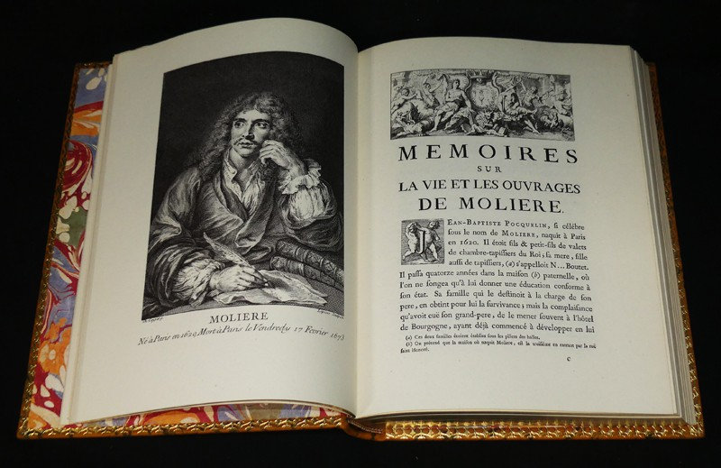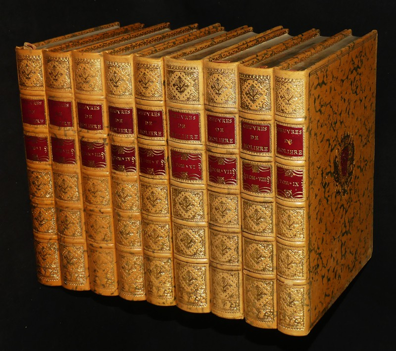 9 volumes in-4, (27 x 20 cm.), relié plein cuir, tranches dorées, dorures sur les plats et les dos titrés, illustrations en noir et blanc de Boucher, réédité pour le tricentenaire de la mort de Molière, fac-similé de l'édition de 1734 ; très bel état.