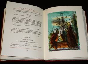 Douze volumes in-8 (20x24.5 cm), reliures d'éditeur plein cuir rouge décorées à l'or et sous emboîtages décorés, têtes dorées, dos à 4 nerfs, un des 2680 exemplaires sur vélin chiffon de Rives, n°617, traduction de François Victor-Hugo, illustrations en couleurs, cet ensemble contient : "Macbeth", "Antoine et Cléopâtre" (illustrations de Douking), "Hamlet" (illustrations de Carzou) ; "Jules César" et "Le Roi Lear' (illustrations de Georges Wakhévitch) ; "Roméo et Juliette" et "Titus Andronicus" (illustrations de Jean-Denis Malclès) ; "La Mégère apprivoisée" et "Les deux gentilshommes de Vérone" (illustrations de Chapelain-Midy) ; "Othello" (illustrations de Léonor Fini) ; "Coriolan" et "Timon d'Athènes" (illustrations de Yves Brayer) ; "La Comédie des erreurs" et "Peines d'amour perdues" (illustrations de Lucien Fontanarosa) ; "Beaucoup de bruit pour rien" et "La Tempête" (illustrations de Lelong) ; "Le Marchand de Venise" et "Les Joyeuses Commères de Windsor" (illustrations de Yves Brayer) ; "La Nuit des rois" et "Tout est bien qui finit bien" (illustrations de Commère) ;