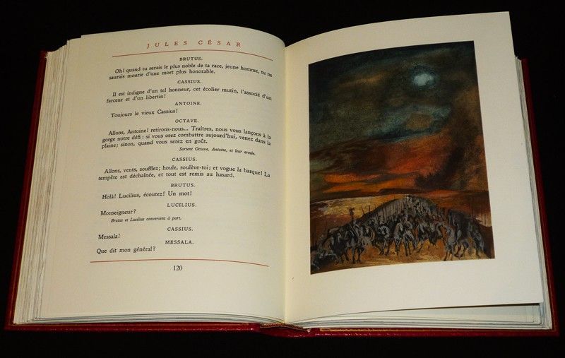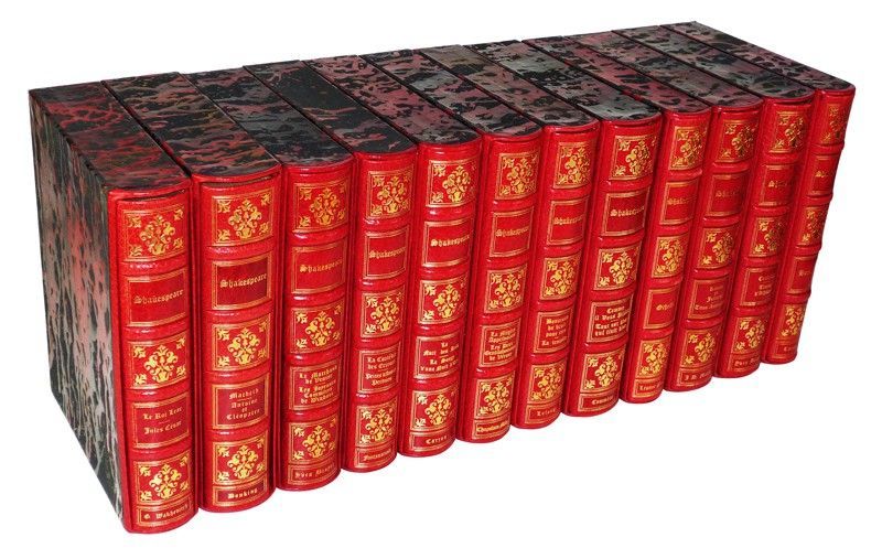 Douze volumes in-8 (20x24.5 cm), reliures d'éditeur plein cuir rouge décorées à l'or et sous emboîtages décorés, têtes dorées, dos à 4 nerfs, un des 2680 exemplaires sur vélin chiffon de Rives, n°617, traduction de François Victor-Hugo, illustrations en couleurs, cet ensemble contient : "Macbeth", "Antoine et Cléopâtre" (illustrations de Douking), "Hamlet" (illustrations de Carzou) ; "Jules César" et "Le Roi Lear' (illustrations de Georges Wakhévitch) ; "Roméo et Juliette" et "Titus Andronicus" (illustrations de Jean-Denis Malclès) ; "La Mégère apprivoisée" et "Les deux gentilshommes de Vérone" (illustrations de Chapelain-Midy) ; "Othello" (illustrations de Léonor Fini) ; "Coriolan" et "Timon d'Athènes" (illustrations de Yves Brayer) ; "La Comédie des erreurs" et "Peines d'amour perdues" (illustrations de Lucien Fontanarosa) ; "Beaucoup de bruit pour rien" et "La Tempête" (illustrations de Lelong) ; "Le Marchand de Venise" et "Les Joyeuses Commères de Windsor" (illustrations de Yves Brayer) ; "La Nuit des rois" et "Tout est bien qui finit bien" (illustrations de Commère) ;