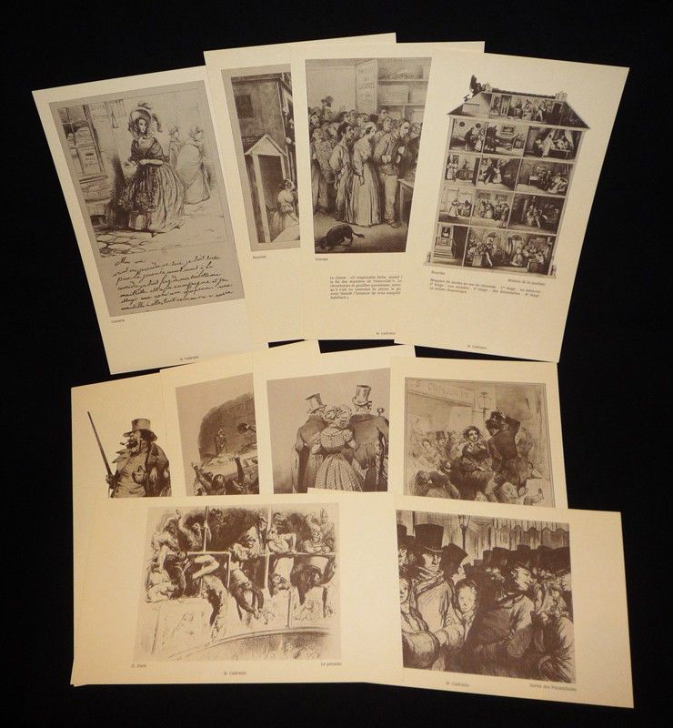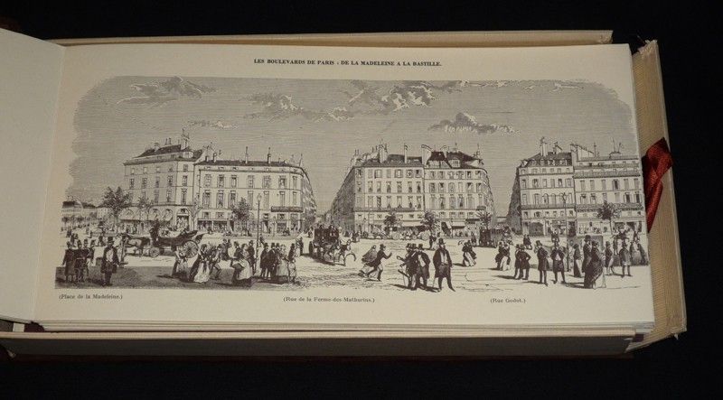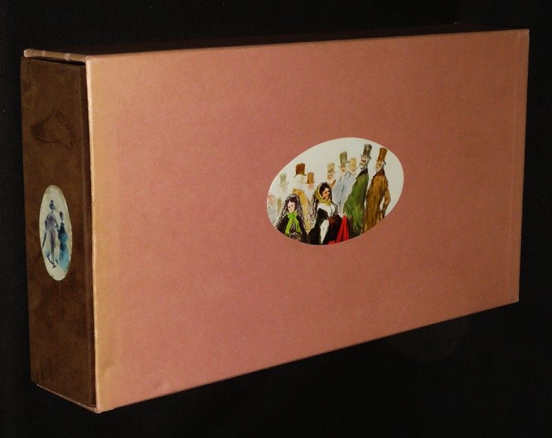 Boîte cartonnée en velours chocolat (33 x 17 x 5,5 cm) et sous étui carton rose, contenant un leporello "Panorama des grands boulevards : Paris romantique, précédé par 'Petite Histoire des grands boulevards' par Georges Poisson et suivi de 'Histoire et physiologie des boulevards de Paris' par Honoré de Balzac'", 10 gravures volantes, et un livret en feuilles titré "Pièces fugitives" ; boîte fendue sur deux arêtes (réparation au ruban adhésif), une des deux cales à l'intérieur de la boîte est décollée, bande insolée et petits incidents sur le bord de l'étui, par ailleurs bon état général.
