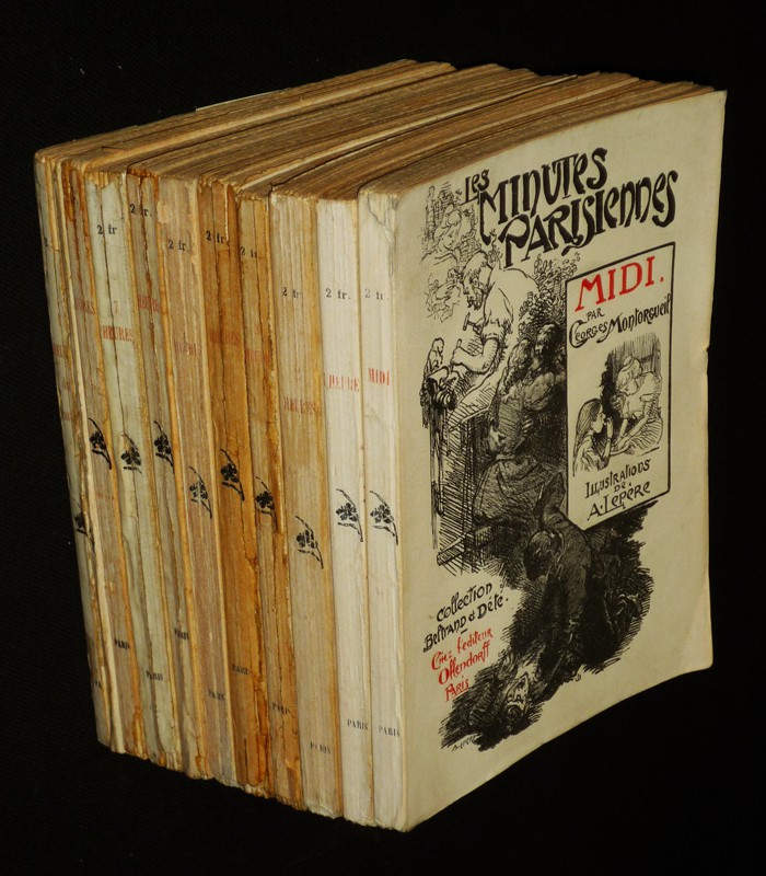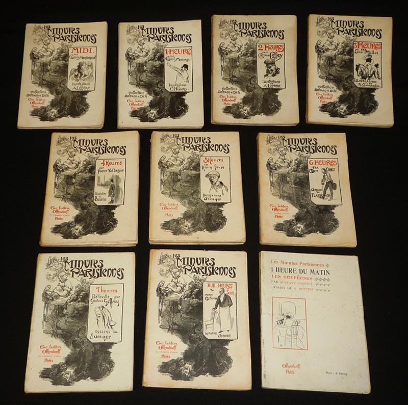 Dix volumes in-12 (11,5 x 15,5 cm), brochés, ex-libris dans chaque volume, 1899-1903, ces "Minutes Parisiennes" écrites et illustrées par un groupe d'écrivains, d'artistes, graveurs sur bois et dessinateurs présentent dans ces recueils les physiologies de Paris. Cet ensemble comprend 10 des 11 recueils parus : "Midi : Le déjeuner des petites ouvrières" par George Montorgueil (avec envoi de ce-dernier) // "1 heure : La Bourse" par Gabriel Mourey // "2 heures : La Cité et l'île Saint-Louis" par Gustave Geffroy // "3 heures : Les Courses, le Grand Prix de Paris" par Léon Millot // "4 heures : L'Essayage" par Pierre Valdagne // "5 heures : La rue du Croissant" par Henri Fèvre // "6 heures : La salle d'armes" par Georges Ohnet // "7 heures : Belleville" par Gustave Geffroy // "8 heures : Dîners parisiens" par Maurice Guillemot // "1 heure du matin : Les soupeuses" par Gustave Coquiot ; dos fendus sur 6 des volumes (dont 5 recollés, 1 reste fragile), quelques traces et petits incidents aux plats plus ou moins importants selon le volume, par ailleurs assez bon état.