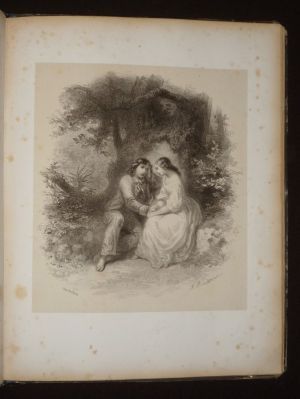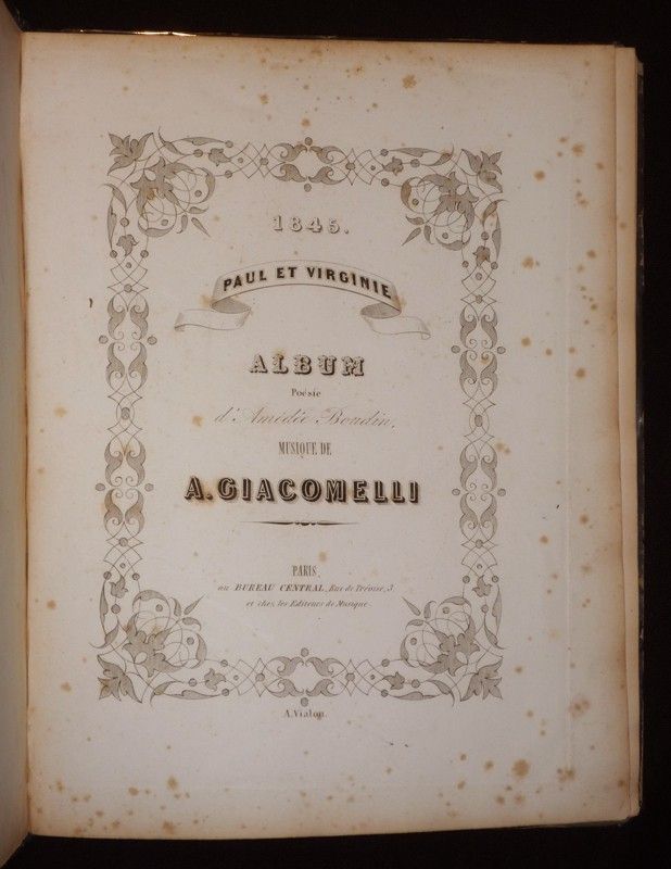 In-4 (23 x 29,6 cm), album cartonné, dos toilé, non paginé, 6 poésies mises en musique par A. Giacomelli, chacune illustrée d'une gravure sur Chine contrecollée ; coins émoussés, coupes frottées, rousseurs à l'intérieur, assez bon état général.