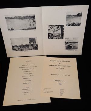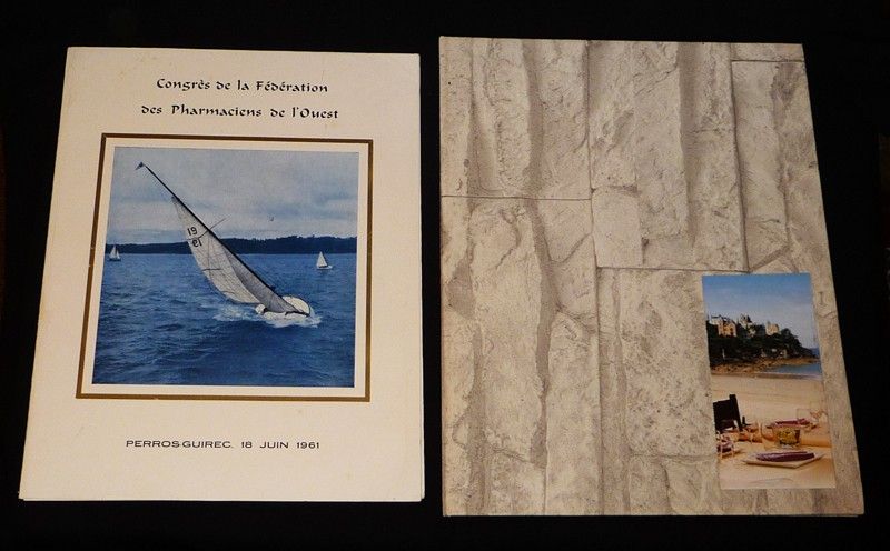 In-4 (25,3 x 32,2 cm), plaquette, menu et programme du congrès de la Fédération des Pharmaciens de l'Ouest tenu à Perros-Guirrec le 18 juin 1961, sous une chemise cartonnée réalisée par un amateur ; quelques, pliures, traces et frottements sur la plaquette, par ailleurs assez bon état général.