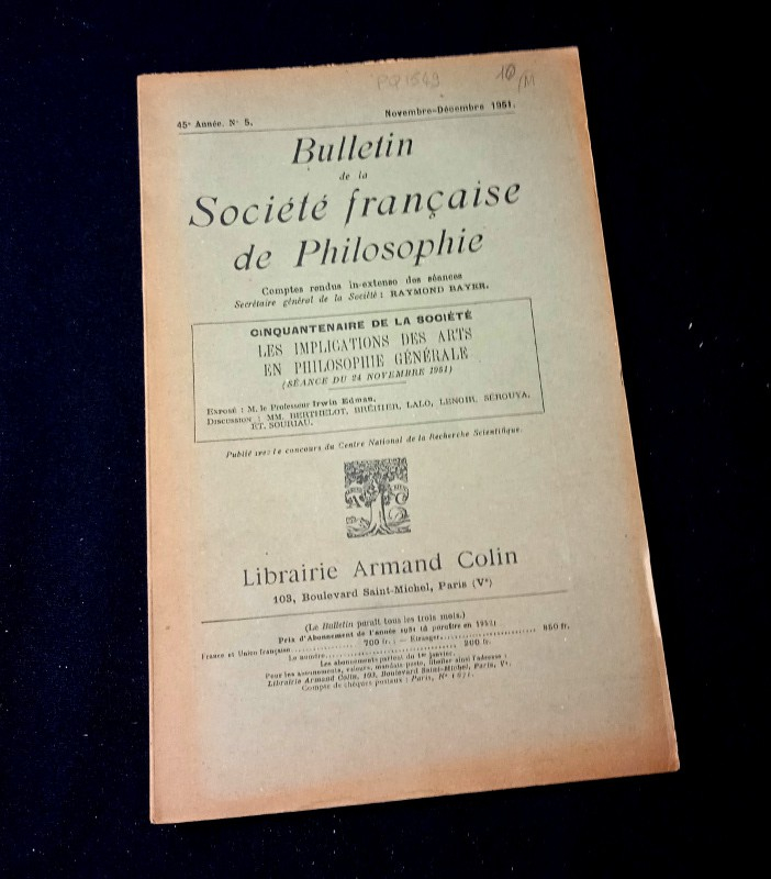In-8 (16,5 x 25,5 cm.), revue en brochure d'éditeur, "Le primat de la perception et ses conséquences philosophiques", de la page 120 à la page 153, quelques annotations dans le texte ; plats...