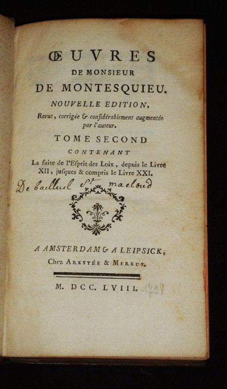 Oeuvres de Monsieur de Montesquieu. Nouvelle édition corrigée et considérablement augmentée par l'auteur. Tome second contenant La Suite de l'Esprit des Loix, depuis le Livre XII, jusques et y compris le livre XXI