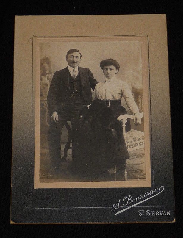 Photographie en noir et blanc (9,5 x 13,7 cm sur support en carton fort 14,8 x 20,2 cm), portrait d'un couple anonyme, photographié par A. Bonnesoeur, artiste-peintre-photographe à Saint-Servan ; quelques traces et marques d'usage sur la photo et dans les marges, assez bon état général.