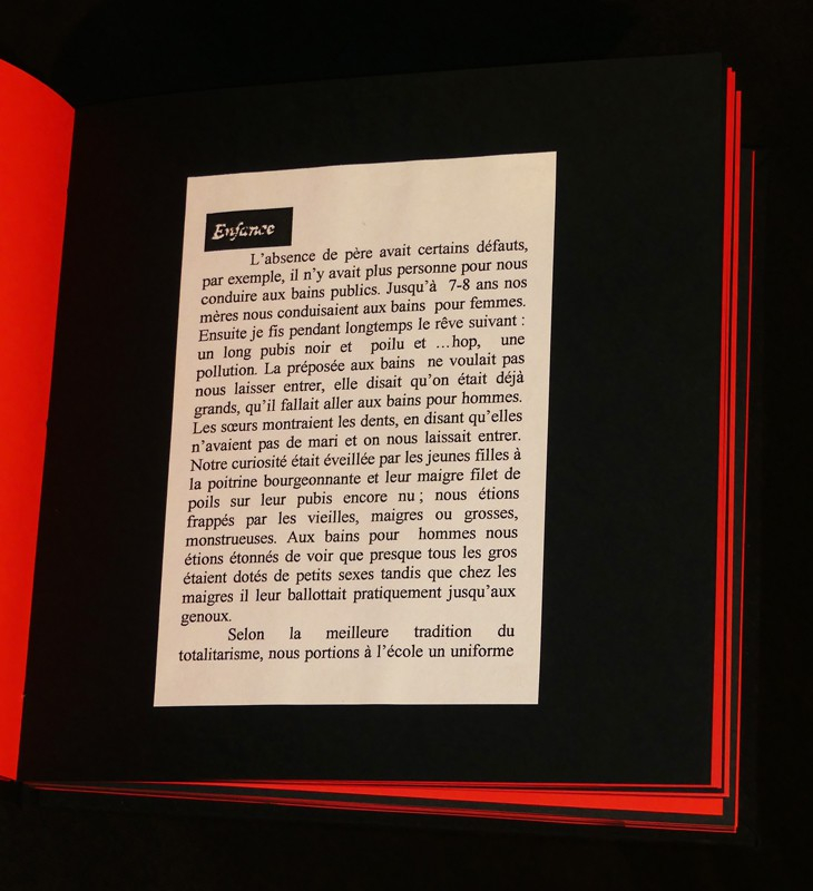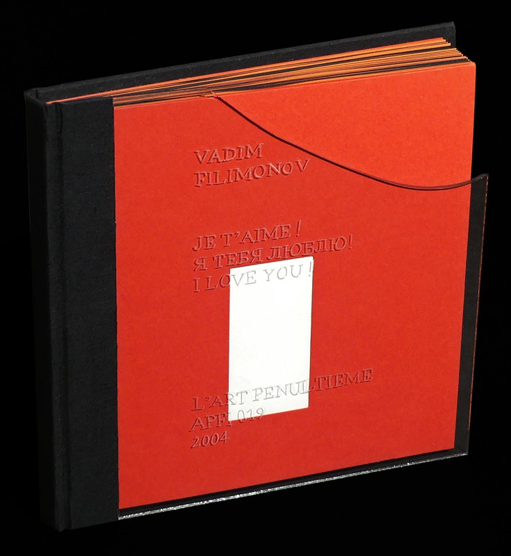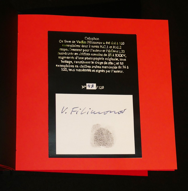 Je t'aime ! est le premier livre monographique consacré à Vadim Filimonov après de nombreux catalogues d'expositions et publications collectives. Le livre alterne photographies et textes autobiographiques afin de mieux cerner le travail du photographe. Les images noir & blanc et couleurs courent sur une période allant des années 80 à la fin des années 90, et le texte s'attarde sur les expériences sexuelles de jeunesse de l'auteur en Russie, alors que celui-ci est étudiant au musée de l'Hermitage. 19 cm x 19 cm. 110 pages. 120 exemplaires numérotés et signés par l'auteur dont 35 exemplaires constituant le tirage de tête augmenté d'une photographie originale. Ici un des 120, le numéro 48 signé par l'auteur. L'ouvrage alterne un papier fort rouge puis noir. Les textes et les reproductions des photographies sont contre collés. Le premier plat est une pièce de verre carré (manque au coin supérieur droit), le quatrième plat est un carton toilé. Mis à part bris de verre en couverture (voir photo) l'ouvrage est en très bon état.