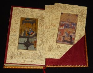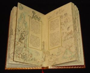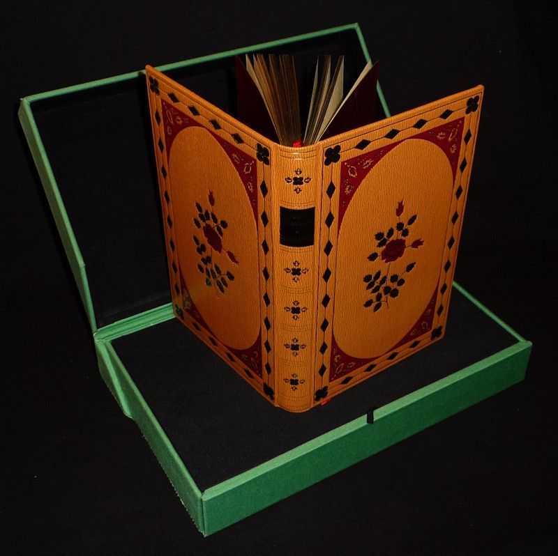 In-8 (15 x 24 cm), reliure pleine peau, dos lisse orné de fleurons dorés et noirs, décor doré, noir et rouge aux plats, tranches dorées, non paginé, texte encadré de dessins, 1 de 400 exemplaires sur japon nacré (ici le n°3), 8 vignettes en tissu de J.-F. Mincet contrecollées sur carton glissées dans une pochette au 3e plat. L'ouvrage est livré dans un emboîtage (20,5 x 32,5 x 5 cm) cartonné toilé vert orné d'une vignette en tissu ; très bel exemplaire.