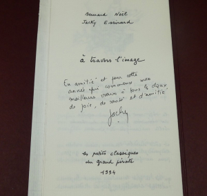 In-8 (11,5 x 21 cm), dépliant sous chemise, 7 volets imprimés recto-verso, exemplaire hors commerce avec envoi du dessinateur Jacky Essirard ; très bon état.