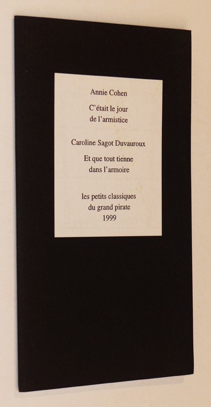 In-8 (11,3 x 21 cm), leporello à 7 volets, imprimés recto verso, deux textes : "C'était le jour de l'armistice" par Annie Cohen, et "Et que tout tienne dans l'armoire" par Caroline Sagot Duvauroux ; très bon état général.