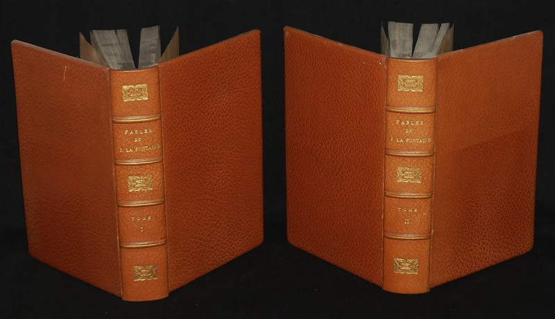 Deux volumes in-8 (14,5 x 21,5 cm), reliure plein maroquin, dos à 4 nerfs ornés de fers dorés, 295 et 392 pages, édition ornée de 255 belles vignettes et du portrait de La Fontaine gravés d'après Oudry ; dos insolés, moitié supérieure du premier plat du tome 2 insolée, quelques rousseurs à l'intérieur, par ailleurs bon état général.